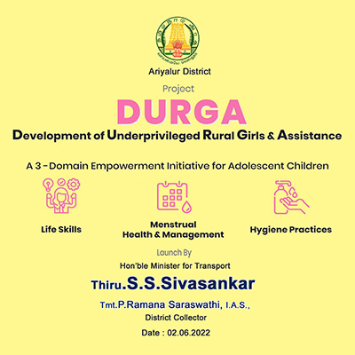 Project DURGA is a 3-domain intervention program for adolescent dropout children in collaboration with Ariyalur District Administration and other social organizations. Project aims to transform the thematic knowledge and behavioural change in Life Skills, Menstrual Hygiene Management and Hygiene Practices in general. The underprivileged and mostly educationally dropout adolescent children of the district is targeted to benefit from the program and create new doors for better future. Williez's Foundation would scale it to other blocks strategically hence covering the need of entire district and generate impact through a changed mindset, attitude and a conductive navigation tools useful for lifelong.